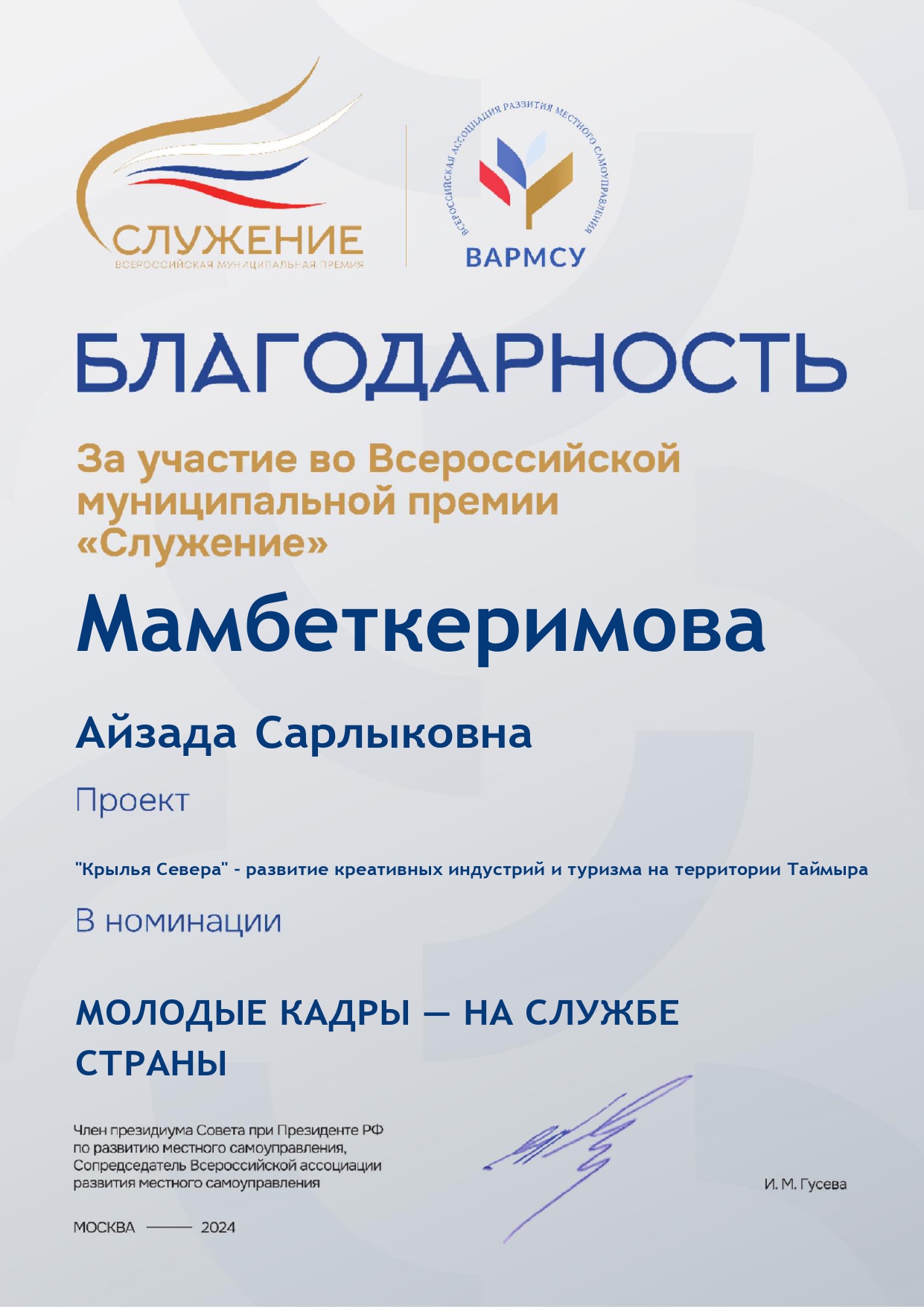 На премию в 2024 году Айзада Сарлыковна представила проект «Крылья Севера» - конкурс дизайнеров одежды в этническом стиле, финальная коллекция одежды конкурса была представлена на дефиле региональных и федеральных площадках – международная туристическая выставка «Енисей» г. Красноярск, международная выставка-ярмарка «Сокровища Севера» г. Москва.